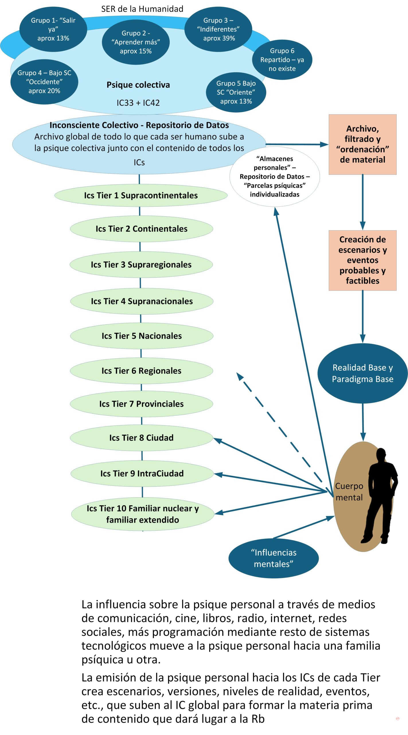 Como veis en el esquema anterior, todos los inconscientes colectivos que forman parte de la estructura mental de la realidad humana están divididos en niveles (Tiers), en los cuales, los niveles superiores abarcan más “espacio psíquico” que los inferiores. Por lo tanto, un IC nacional abarca e influencia al cuerpo mental de todas las personas que viven dentro de un mismo país teniendo éste un alcance mayor, que, por ejemplo, un IC familiar nuclear que solo abarca e influencia a las personas que conviven juntas en una misma familia.