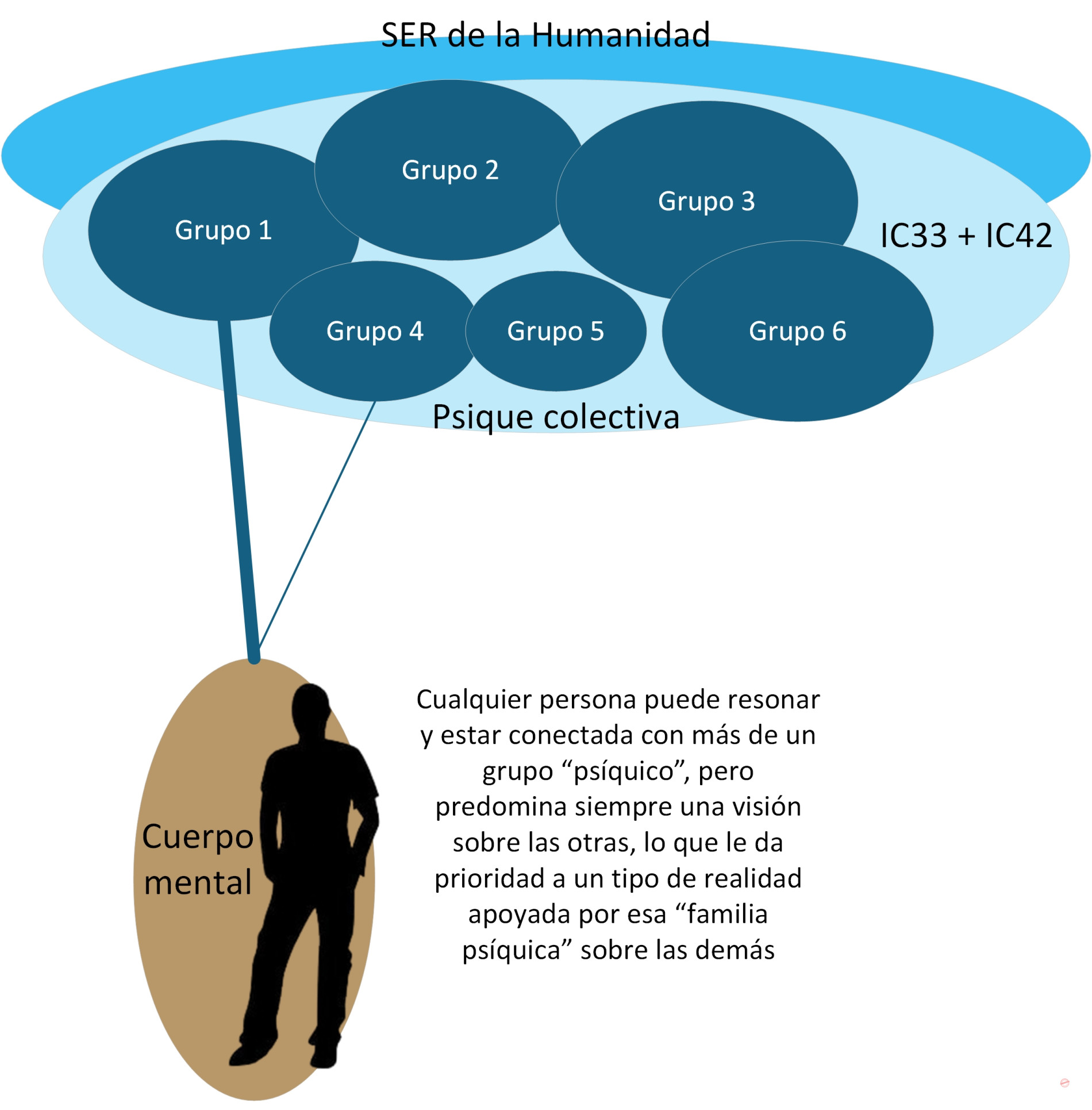 - En paralelo, además de “subir” todo lo que tenemos en nuestro cuerpo mental a nuestro “almacén mental personal”, todo el contenido de aquello que generamos, pensamos, imaginamos, soñamos, proyectamos, etc., se sube también a todos los ICs a los que estemos conectados, que, básicamente, para cualquier ser humano, son todos los de la lista anterior.